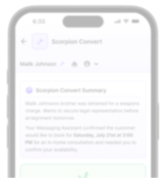 Scorpion convert works out of the box. No setup, no scripts, no extra tools. It’s trained on your data, customized to your firm and connected to your CRM.