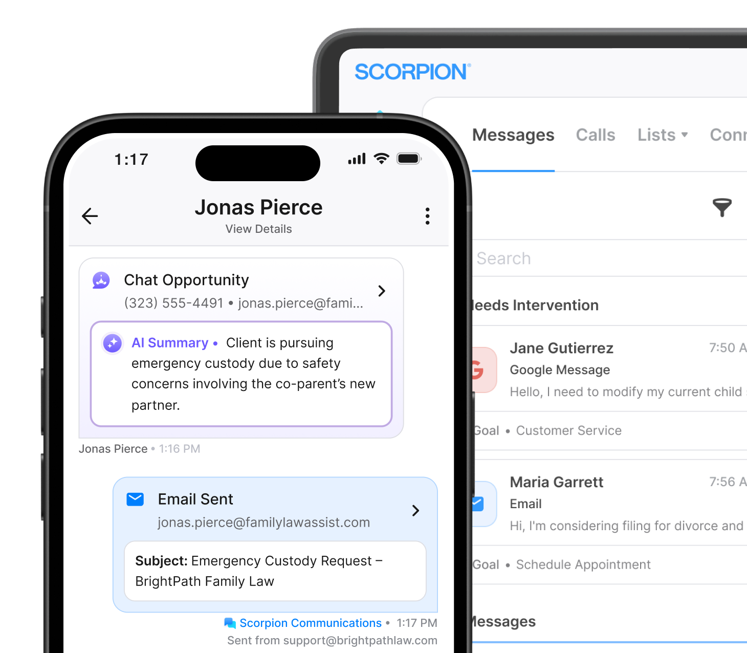 From initial inquiry to signed retainer, the Scorpion platform gives you the visibility you need. Track leads, appointments, and performance—all from your phone or desktop.