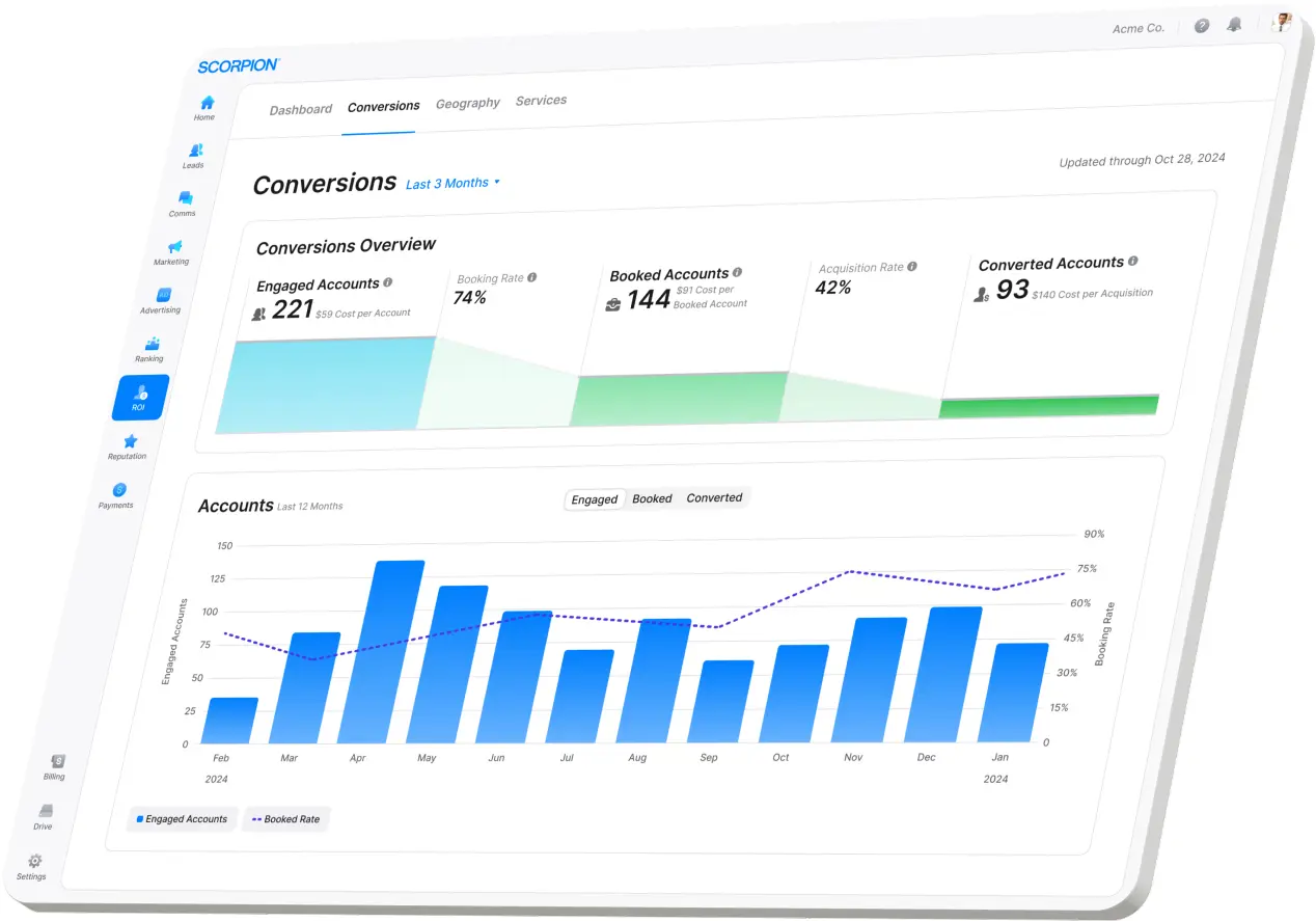 For example, Scorpion offers a revenue dashboard and roll-up reporting that provides franchise businesses with the overall picture of the effectiveness of their marketing efforts. Scorpion integrates with leading CRMs, like ServiceTitan, to further enhance this capability by providing complete metrics and reporting, tied to revenue.