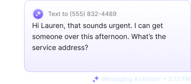 The Messaging Assistant responds instantly to contact forms from your website, leads from Google Local Services Ads, Facebook Messenger inquiries, and follows up to missed calls through text message. It automatically engages leads, schedules appointments when applicable, and escalates when needed.