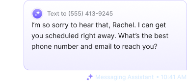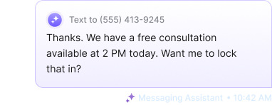 Messaging Assistant instantly responds to missed calls, texts, website chats, Facebook messages, LSA leads, and contact forms, 24/7.