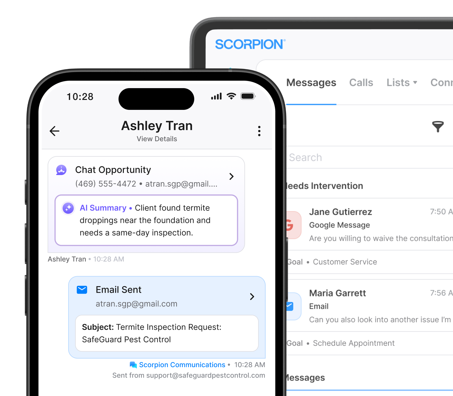 Scorpion ConnectNever miss an opportunityWith Scorpion Connect, you get a 24/7 AI customer service rep that can answer questions, book appointments, accept payments, and educate customers.